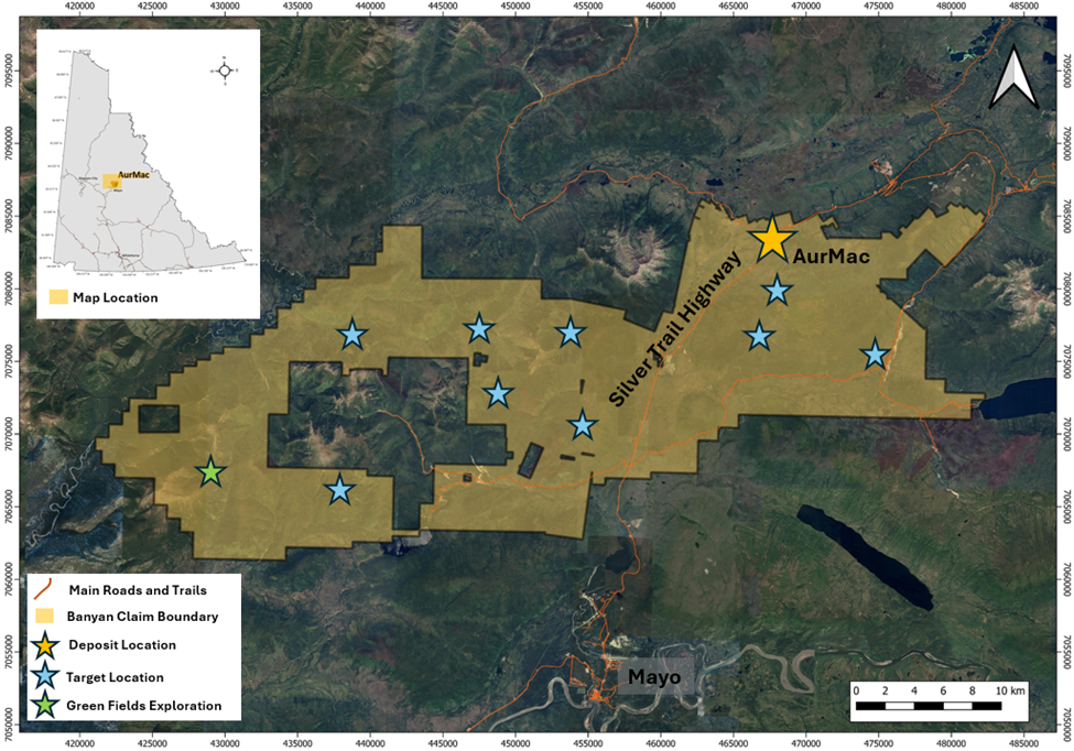 Banyan’s primary asset, the AurMac Project is located in the Traditional Territory of First Nation of Na-Cho Nyäk Dun, in Canada’s Yukon Territory. The current Mineral Resource Estimate (“MRE“) for the AurMac Project has an effective date of June 28, 2025 and comprises an Indicated Mineral Resource of 2.274 million ounces of gold (“ Au “) (112.5 M tonnes at 0.63 g/t) and an Inferred Mineral Resource of 5.453 Moz of Au (280.6 M tonnes at 0.60 g/t ) (as defined in the Canadian Institute of Mining, Metallurgy and Petroleum (“CIM“) Definition Standards for Mineral Resources & Mineral Reserves incorporated by reference into NI 43‑101). The 303 square kilometres (“sq km“) AurMac Project lies 40 kilometres from Mayo, Yukon. The AurMac Project is transected by the main Yukon highway and benefits from a 3-phase powerline, existing power station and cell phone coverage.