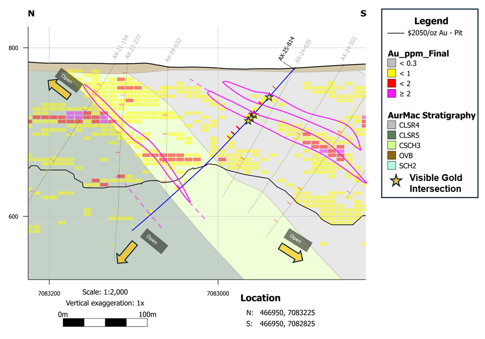Figure 3: Cross-section A-B in Central Powerline (See Figure 1). High-grade mineralization in AX-25-819 and -821 has the potential to extend mineralized domains below the conceptual pit boundary from the 2025 Mineral Resource Estimate (“MRE“). Magenta outlines show preliminary potential mineralized zones. Once refined, these domains will aid in better constraining estimations of the distribution of gold in the MRE.