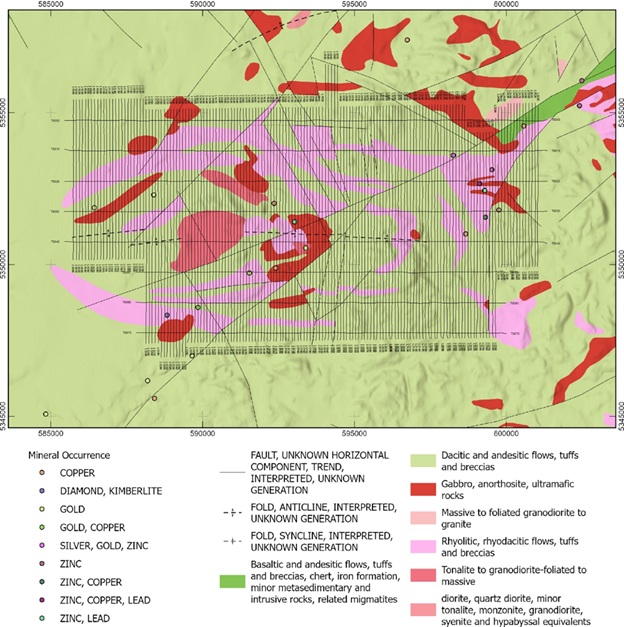 Underpinning the geology of the project area is a domal anticlinal package of mafic and felsic volcanic rocks wrapped around the Clifford Stock. Northeast and northwest synvolcanic structures are excellent targets for Noranda-type VMS deposits2. The layered mafic-rhyolitic volcanic package reflects a flow dome complex that hosts the Doyon-Bousquet LaRonde gold-rich VMS deposits.