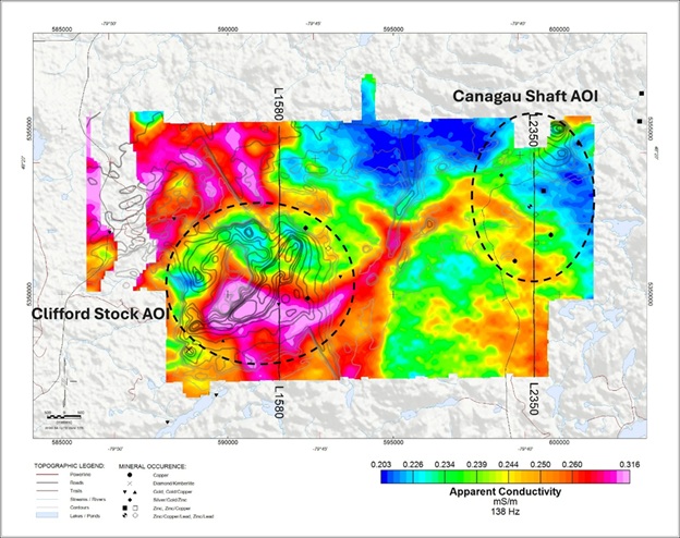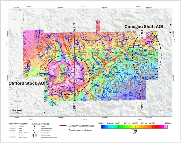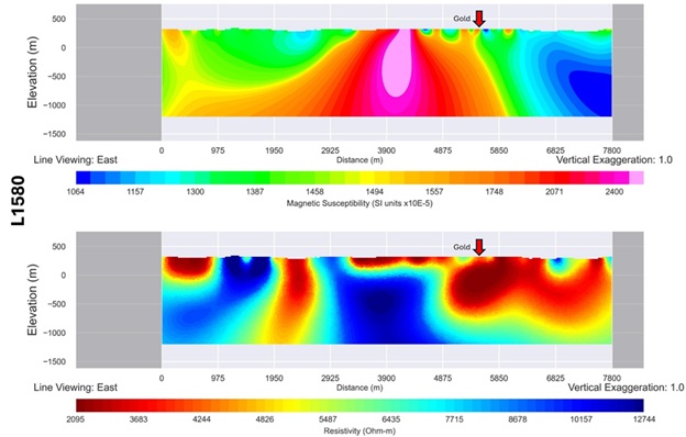 See below Figures 6 and 7 and captions describing the details for profile lines L1580 and L2350 related to the historical mineralization occurrences and their related MT magnetic and conductivity responses: