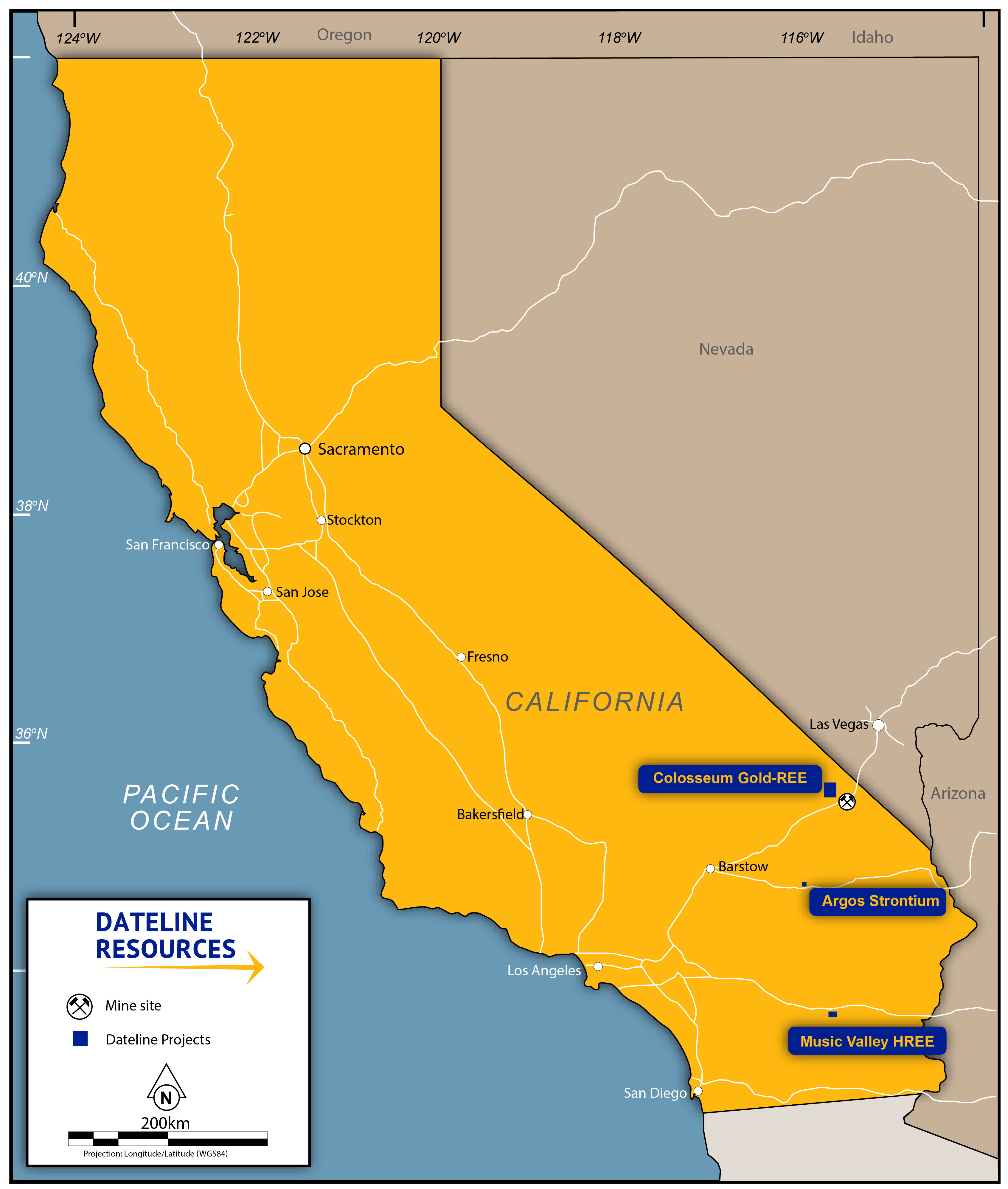 Dateline Resources Limited (ASX:DTR)(OTCQB:DTREF)(FSE:YE1) is an Australian company focused on mining and exploration in North America. The Company owns 100% of the Colosseum Gold-REE Project in California.