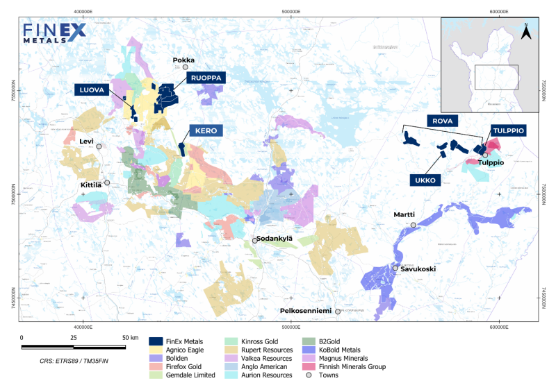 Vancouver, British Columbia, February 5, 2026 – TheNewswire – FinEx Metals Ltd. (TSX-V: FINX) (“FinEx” or the “Company”) is pleased to announce that it has been granted the Kero mineral exploration license by the Finnish Mining Authority (“TUKES”). The 100%-owned Kero gold project is located in the Central Lapland Greenstone Belt (“CLGB”) of northern Finland, approximately 15 km southeast of Agnico Eagle’s Kittilä gold mine, Europe’s largest primary gold operation and approximately 20 km northwest of Rupert Resources’ multi-million-ounce Ikkari discovery (Figure 2)1.