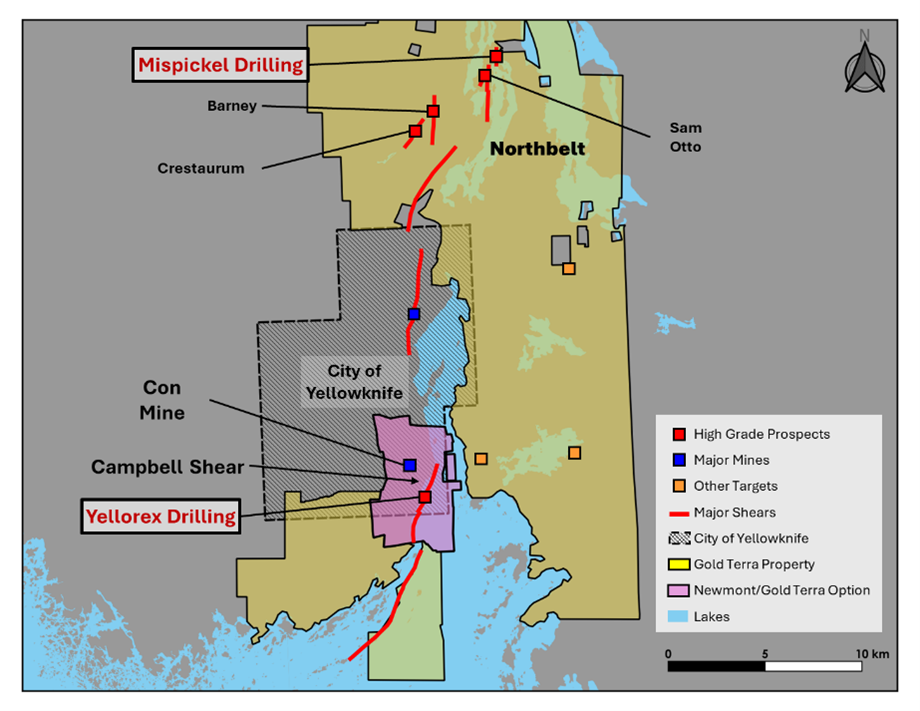Four diamond drill rigs are currently active on the Yellowknife Project as shown in Figure 1. A total of ten drill holes has been completed to date, comprising eight holes on the Campbell Shear target south of the Con Mine and two holes at the Mispickel target within the Northbelt area north of the city of Yellowknife.