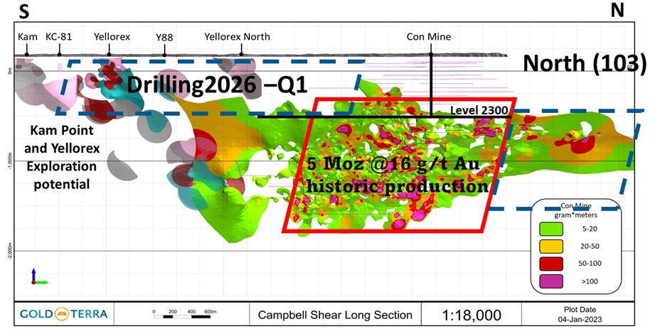 Chairman and CEO, Gerald Panneton, commented, “Our winter drilling program is progressing well with the objective to add additional ounces to our current mineral resource estimates. The drilling on the Yellorex is targeting areas where there was room to add ounces with not enough drilling, and to increase the number of ounces in the indicated category. With two (2) drill rigs coring on the Con Mine Option, our program is advancing well with more than 2600 metres to date. Gold Terra’s 100% land tenure covers more than 70 kilometres of strike length of the past-producing high-grade Campbell Shear in one of Canada’s largest historic gold belts.”
