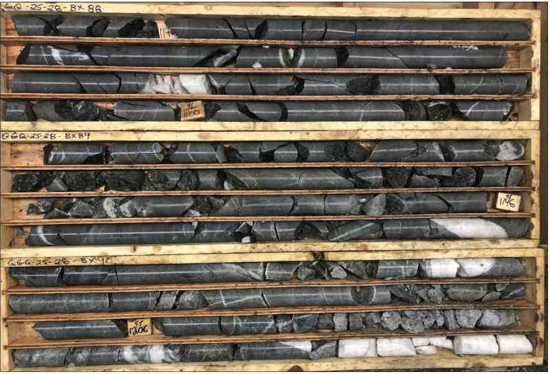Photo 1: Example of diamond drill hole QGQ25-28 core which exhibits extensive quartz-carbonate veining.