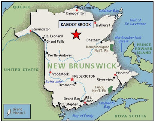 The Kagoot Brook Property consists of one mineral claim covering an area of approximately 767 hectares, covering reported historical cobalt stream and spring sediment / silt geochemical anomalies, with some samples reported from two streams (tributaries of Kagoot Brook) reported to be highly anomalous for cobalt. Such anomalies were reported by the New Brunswick Department of Natural Resources in the early 1980s along two northeast trending streams, one flowing from the southwest to north-central region of the Kagoot Brook property and the other stream within the eastern region of the property. Five samples from these streams were reported to return highly anomalous cobalt values in the 801 – 1316 ppm range (Davies, 1982).