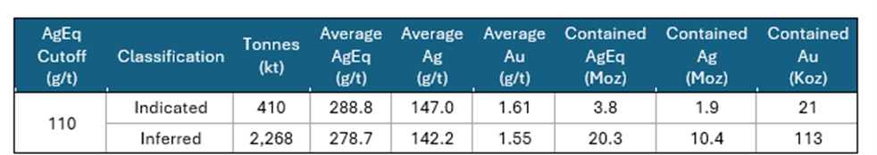 (2.27 Mt @ 142.2 g/t Ag and 1.55 g/t Au, containing10.4 Moz Ag and 113 Koz Au)