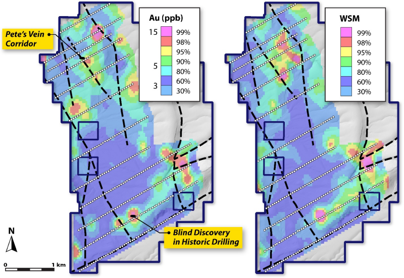 The soil survey, completed on 50-metre-spaced samples along broadly spaced orientation lines, highlights coherent pathfinder element anomalies that align with mapped northwest-trending structures and areas of silicification and clay alteration. These results provide important vectors for drill targeting, particularly where geochemical anomalies coincide with mapped or inferred structures, such as in the area of Pete’s Vein in the northern project area.