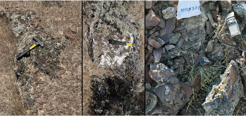 Figure 2: Left and Centre: “Pete’s Vein”—Outcropping high-level chalcedonic quartz-opal vein with sparse bladed quartz-after-calcite epithermal boiling texture. Right: Rhyolite flow with chalcedonic quartz crackle breccia and highly anomalous pathfinder element geochemistry (579 ppm As, 167 ppm Mo, 50 ppm Sb, 1% Mn)