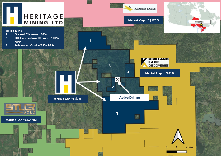 “Consolidating this ground around the historic Melba Mine is a meaningful step in building Heritage’s footprint in one of Canada’s most proven gold camps. We look forward to further updates on our current diamond drill program in short order”. Commented Peter Schloo, President CEO, and Director of Heritage