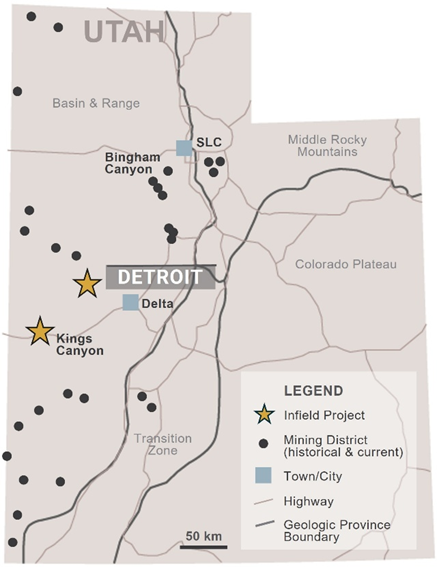 The Detroit project is a compelling exploration opportunity within the Drum Mountains region of western Utah, situated approximately 65 kilometres northwest of the Company’s Kings Canyon property and 160 kilometres southwest of the Bingham Canyon mining district (Figure 1). Approximately 5,115 acres of primarily metalliferous mineral leases with the State of Utah (The School and Institutional Trust Lands Administration) and minor unpatented mining claims (Bureau of Land Management) comprise the Property. The Property is located within a vast desert landscape characterized by modest topography and excellent infrastructure, including direct road access from Delta, Utah – less than one hour drive from the project site. This strategic location would enable Infield to leverage significant cost and logistical synergies with the Kings Canyon project.