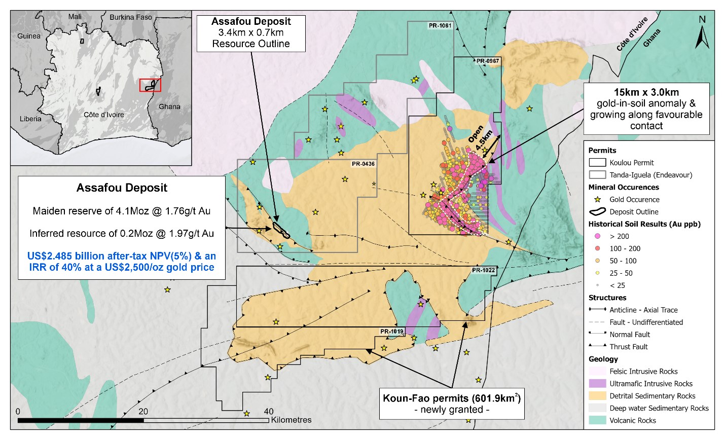 Figure 1. Regional overview of the newly granted Koun-Fao permits, Assuéfry permit, and Endeavour Mining’s Tanda-Iguela permits