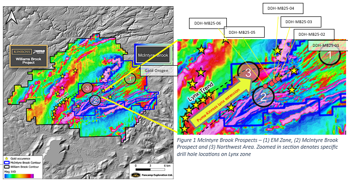 Six drill holes targeting the extension of the Lynx Zone of the Williams Brook Project on the Kinross-Puma ground.