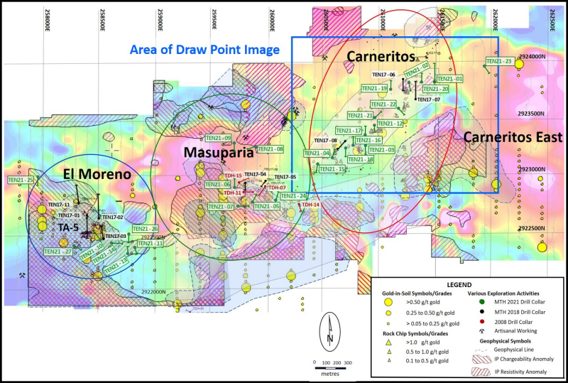 Company geologists have sifted through a combination of thousands of surface chip, channel and nearest drill-hole gold-silver assay results, combined with studying geological features and access points to identify areas with higher-than-average grades that would serve as potential draw points for small-scale, gold-silver mineral extraction and pilot leach test within the large 1.5 by 0.5 kilometre Carneritos area. Refer to Table 1 – Average Grades within Draw Point Locations, accompanied by Figure 1 – Location Map – Mineralized Areas within the Tenoriba Project and Figure 2 – Location Map – Carneritos Area Draw Points, which illustrate the average grades associated with each draw point and the locations of these draw points within the Tenoriba project and Carneritos area, respectively.