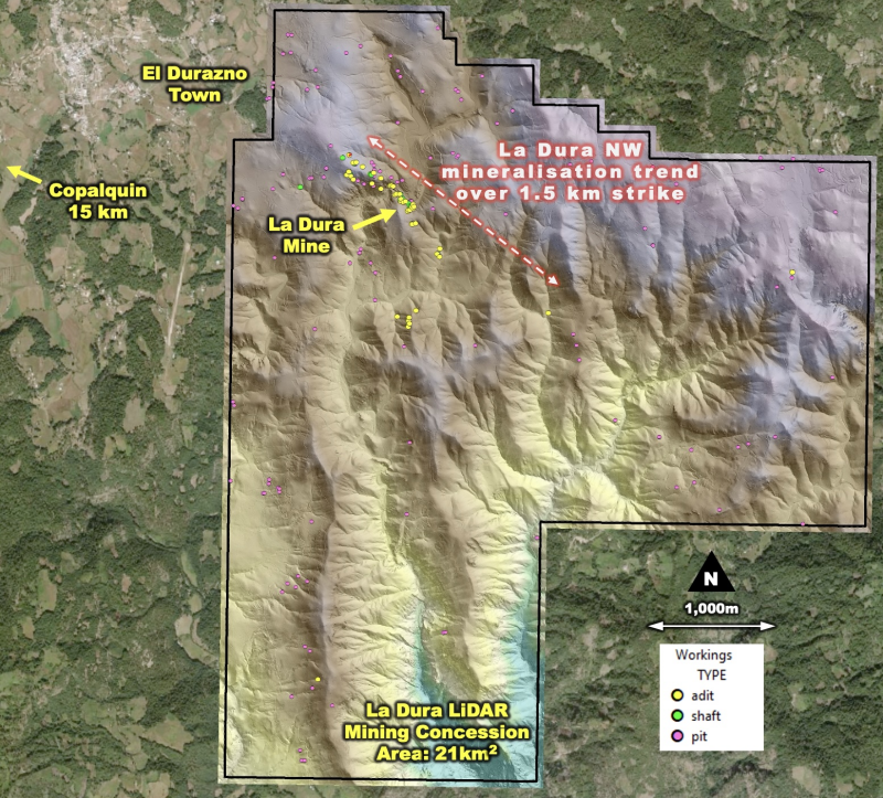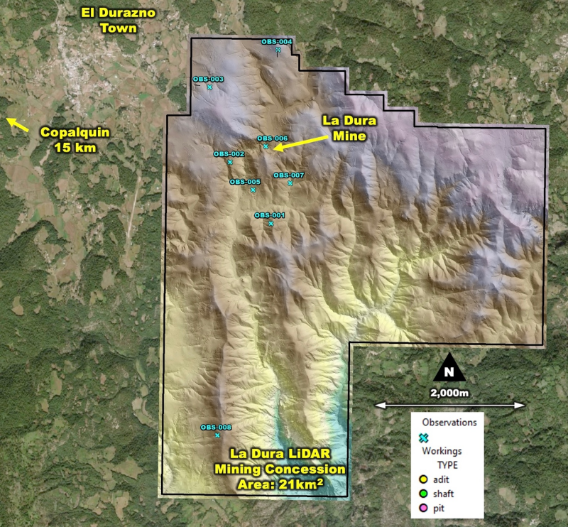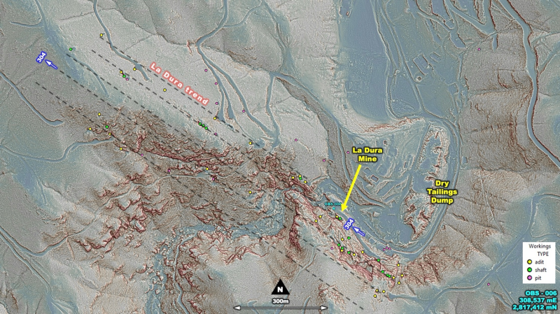 Figure 2 LiDAR interpretation yields 44 adits, 18 shafts, and the remainder being 134 shallow prospecting pits. Most of the mining activity is located on and around the La Dura Mine. A second cluster of adits is located approximately 1km to the South.