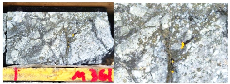 Note: Hydrothermal breccia with strong sulfide mineralization. Left image is cut NQ core, right image is enlarged (note the yellow mineral (orpiment) for scale and position).