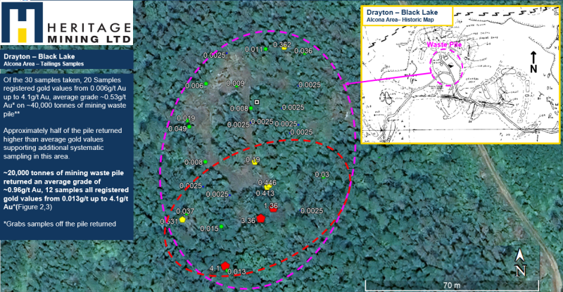 “The price of precious metals are holding strong at their current values with macro indications of continued upward movement. This scenario enables our Company to consider alternative and less dilutive sources of capital. Initial grade estimates from waste piles are encouraging and supported additional testing with guidance of our board, management and strategic advisors holding a wealth of experience in this sector. We look forward further updates in short order.” Commented Peter Schloo, President, CEO and Director of Heritage Mining Ltd.
