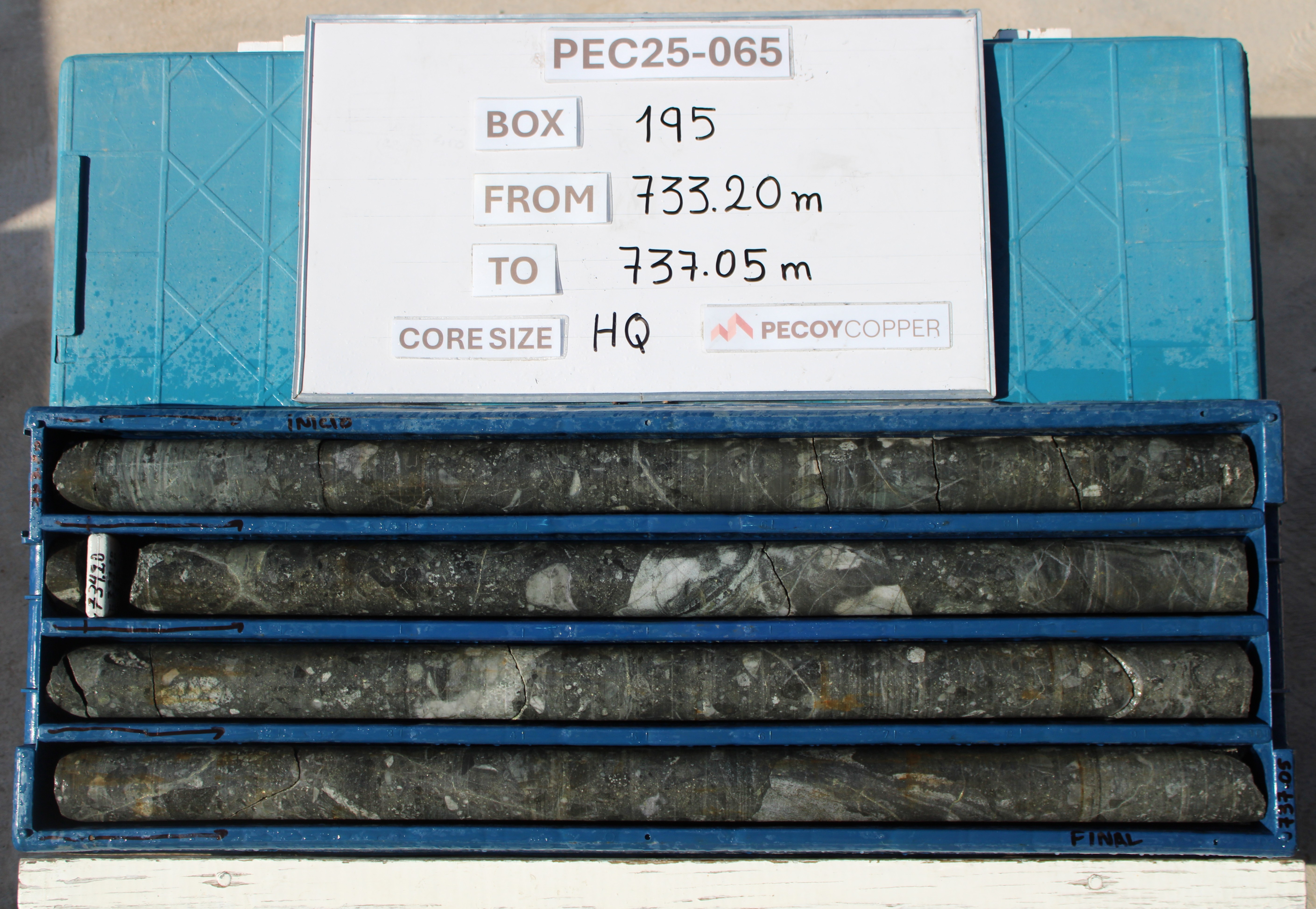 Hole PEC-25-065 targeted the South Breccia Zone, where mineralization is hosted within brecciated and altered intrusive and is characterized by chalcopyrite, gold, silver and molybdenite, consistent with a large porphyry-related system. Magnetite abundance appears, at times, spatially associated with higher gold values.