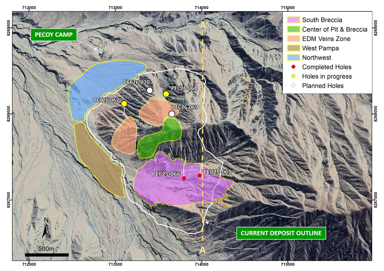 Figure 2: Plan view of the Pecoy Project showing the current deposit outline, principal mineralized zones, and current Phase 1 drill hole locations
