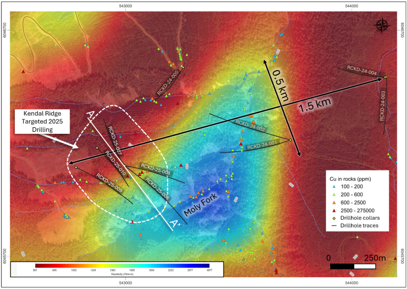 Assay results from the program confirm additional highly anomalous copper and moly tenor similar to the initial discovery drill program in 2024. Increasing copper mineralization with anomalous gold and silver is strongest in drill holes RCKD-25-007 and RCKD-25-010 and associated with highly altered diorite porphyry in the central portion and eastern flanks of Kendal Ridge (Figures 3, 4, and 6). Zones of higher-grade moly are confined to the eastern portion of Kendal Ridge and are interpreted as a separate mineralizing event. The Kendal Ridge area mineralization remains open with elevated copper mineralization interpreted to be associated with a conductive zone trending to depth (Figure 7).