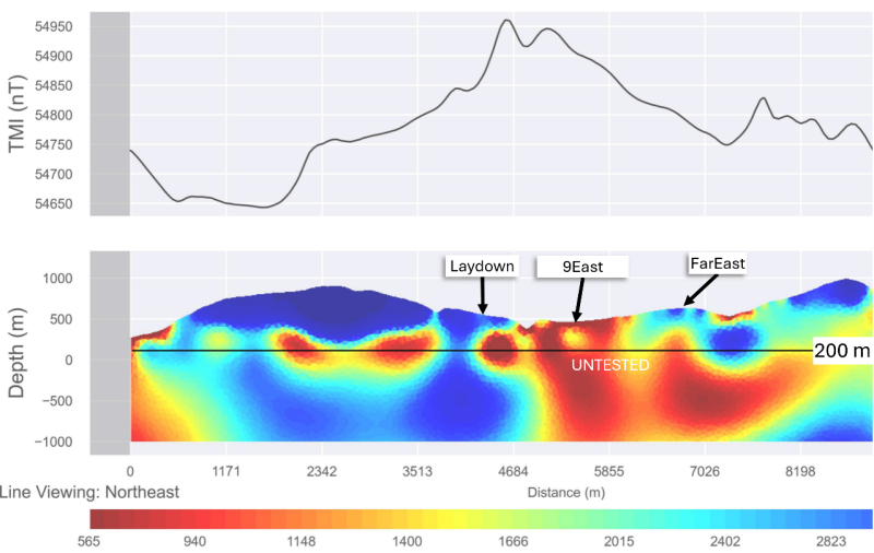 FarEast – A >400 m wide zone above a north-trending conductive feature that is characterized at the surface by copper and gold-in-soil anomalism. East of the conductive feature (and east of the limits of the soil geochemical survey) is a prominent 700 m wide circular resistor. Between FarEast and 9East are several smaller zones with associated copper-gold-silver in soil anomalism that may link the bigger zones.