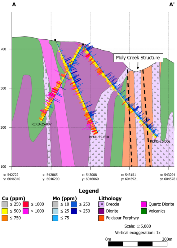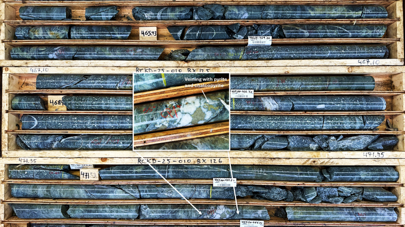Assay results from the program confirm additional highly anomalous copper and moly tenor similar to the initial discovery drill program in 2024. Increasing copper mineralization with gold and silver is strongest in holes RCKD-25-007 and RCKD-25-010 associated with highly altered diorite porphyry in the central portion and eastern flanks of Kendal Ridge. Zones of elevated moly are confined to the eastern portion of Kendal Ridge and are interpreted as a separate mineralizing event.