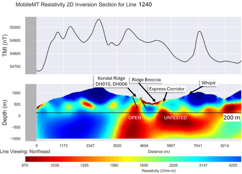 Areas with high resistivity and subdued magnetic responses within the Kendal Ridge zone appear closely associated with altered porphyry intrusions that host multiple generations of complex porphyry-style veins and variable alteration. These porphyry intrusions are important mineralized hosts based on significant alteration and multiple generations of B-type veins throughout. Importantly, the porphyry intrusions identified to date are interpreted to be intramineral and not interpreted to be the causative intrusion at Kendal, which has not yet been identified.