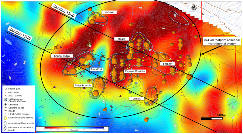 On the western flanks of the Kendal system, rocks are well exposed in a series of intersecting drainages. To better evaluate the expanded potential of the less exposed eastern portion of the Kendal system, the Company completed a large-scale soil geochemistry program in the second half of 2025. Assay results identified new and highly anomalous copper, moly, gold and silver zones east of the Kendal and Moly Fork drainages. These anomalies correspond with significant MobileMT conductive and resistive features. Notably, the area immediately east of Kendal Ridge is known to host breccias containing copper-moly mineralization and high-grade hypogene chalcocite veining, with reported grades of up to 27.5% copper.