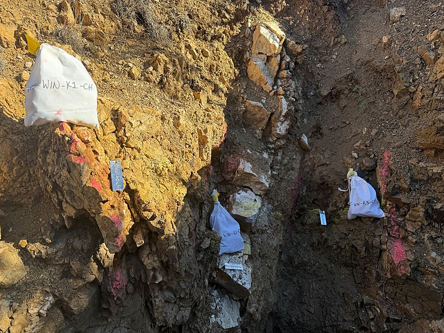 In addition to the newly identified Poverty Creek Trend, systematic channel sampling identified another structurally controlled mineralized corridor in the northwestern portion of the claim block. As part of the program, continuous channel samples were collected perpendicular to exposed in situ veins to better represent true vein width and mineralization distribution.