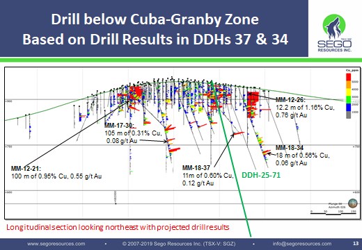 Figure 2. Longitudinal section looking northeast, showing the drill hole DDH25-71 and drill holes MM-18-37 and MM-18-34 with projected drill results.