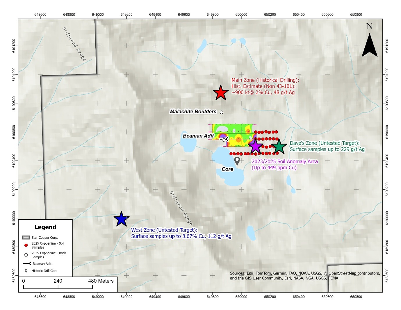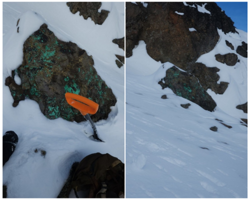 While attempting to access historic trenches (obscured by snow), the field crew observed large boulders with visible malachite on slopes below the historic Main Zone. Two grab samples were collected. These boulders are interpreted as talus likely derived from the Main Zone mineralization upslope, providing additional confirmation of copper mineralization in the area.