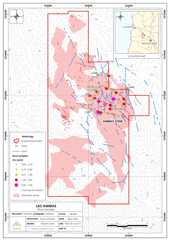The Las Animas property covers a 10-kilometre stretch of the Atacama Fault System 12 kilometres northwest of Capstone Copper´s Manto Verde open pit copper mine which, after 28 years of production, had recently reported measured and indicated resources exceeding 594 MT1 with grades ranging from 0.35 to 0.57% Cu, together with 0.09 to 0.1 g/t Au and with 85 to 175 ppm Co. It should be noted that the information pertaining to the Manto Verde mine is not necessarily indicative of mineralization on the Las Animas property.