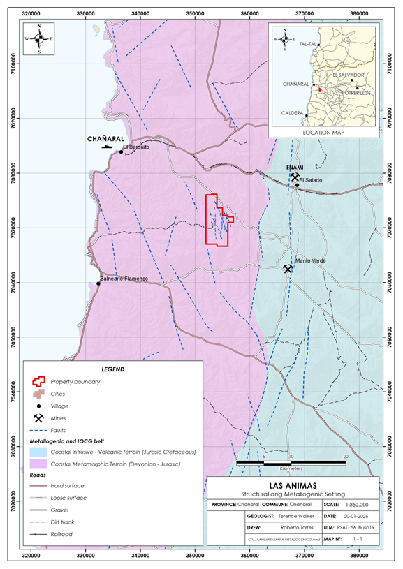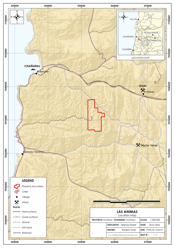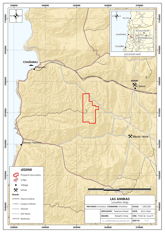 The Las Animas property is located in Chile, approximately 725 kilometres north of Santiago and is within the historic Las Animas high grade oxide copper-gold mining district. It is readily accessible by paved and good gravel roads from the coastal city of Chañaral, 25 kilometres to the northwest (see Figure 1).