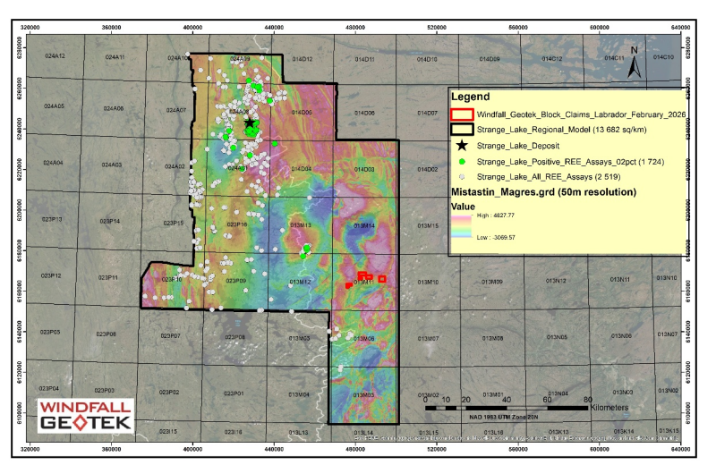 Brossard, Québec – TheNewswire – February 5, 2026 — Windfall Geotek Inc. (CSE: WIN; OTCQB: WINKF) (“Windfall” or the “Company”), a leader in the application of Artificial Intelligence (AI) and machine learning for mineral discovery since 2005, is pleased to announce the successful modeling and extraction of the geophysical and geochemical “digital signature” for the Strange Lake Rare Earth Element (REE) Deposit.
