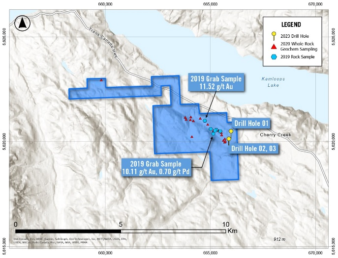 Fieldwork has identified a mineralized quartz-feldspar porphyry body intruding Nicola Group volcanics. Historical sampling (1983–1984) delineated a 200 m × 400 m anomalous zone with gold values up to 3.5 g/t. Grab samples taken from the property in 2019 include values of 10.1 g/t Au (with 0.7 g/t Pd), and 11.5 g/t Au, confirming high-grade surface mineralization.