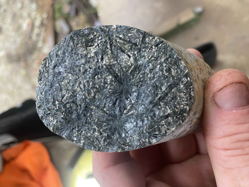 Figure 1: Molybdenite (MoS₂) observed in drill core as fracture-controlled mineralization with tourmaline