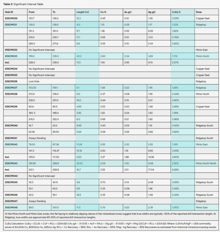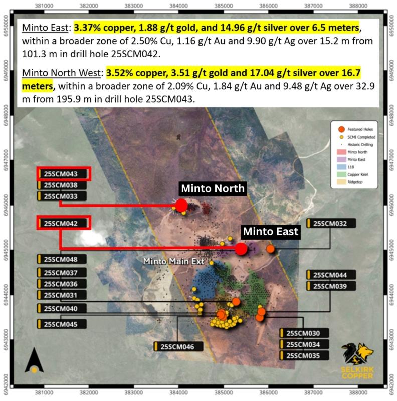“These latest drill results continue to grow our confidence in the Minto property, including the Minto North zone, Minto East zone, and Ridgetop zones. Combined with positive results from recent metallurgical test work, we are making progress to have sufficient grade and continuity to support our targeted 12-15 year mine life and restart plan,” stated Colin Joudrie, Selkirk Copper President & CEO.