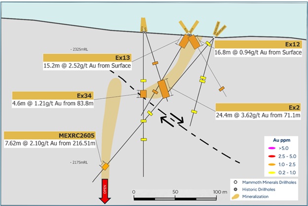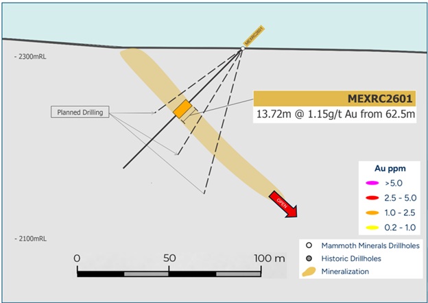 13.72m @ 1.15 g/t Au from 62.5m (MEXRC2601)