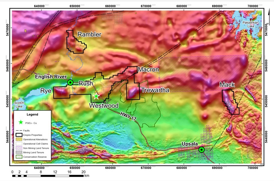 The Empire Project group of properties comprises the Empire, Mack, and Rambler claim blocks, covering more than 15,000 hectares within the Marmion Terrane — a geological domain historically overlooked due to glacial cover but increasingly recognized for its magmatic nickel-copper-platinum group element potential.