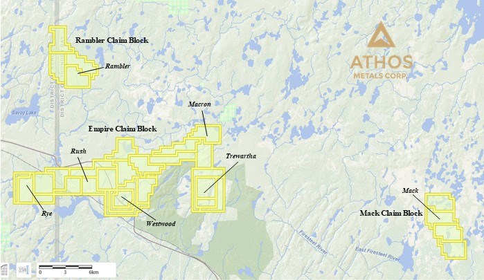 The Rye, Rush, Macron and Trewartha targets stretch over 18 km of the Empire Claim Block. The magnetic survey and exploration drill holes from 2023-2024 gave rise to the perception that the geology previously tested at the Westwood target, extended west-east through the Empire Claim Block. This geological observation has been supported by desk-top studies by the Company’s exploration team. Athos expects the VTEM+ survey to learn deepen its understanding of this proposed geological trend. With this new data, the Company will vector into its models’ those areas of suspected sulphide mineralization which will, in turn, shape the 2026 drill program.