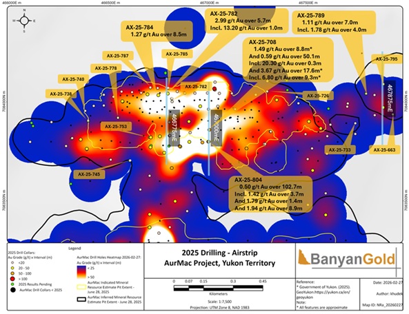 VANCOUVER, BC / ACCESS Newswire / March 10, 2026 / Banyan Gold Corp. (the “Company” or “Banyan“) (TSXV:BYN)(OTCQB:BYAGF) is pleased to announce additional drill results with high-grade gold (“Au“) mineralization in the Airstrip Deposit (“Airstrip“) at its AurMac Project (“AurMac“), Yukon, Canada.