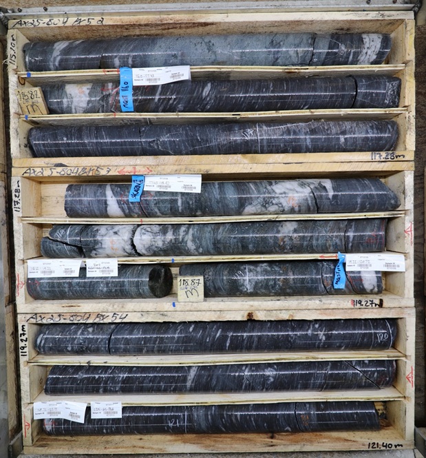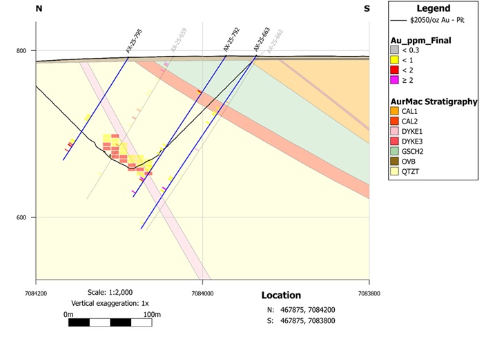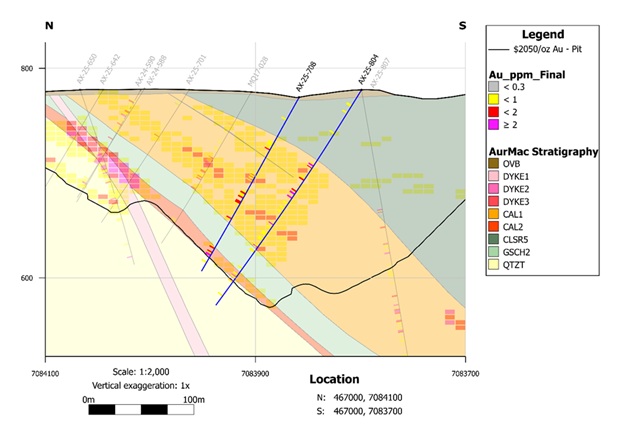 AX-25-804 – 1.42 g/t Au over 3.7m, 1.79 g/t Au over 1.4m, and 1.94 g/t Au over 8.9m, all within 0.50 g/t Au over 102.7m.