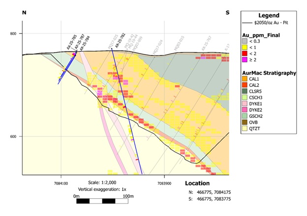 AX-25-782 – 2.99 g/t Au over 5.7m including high-grade interval of 13.20 g/t Au over 1.0m, AND 0.47 g/t Au over 32.8m;