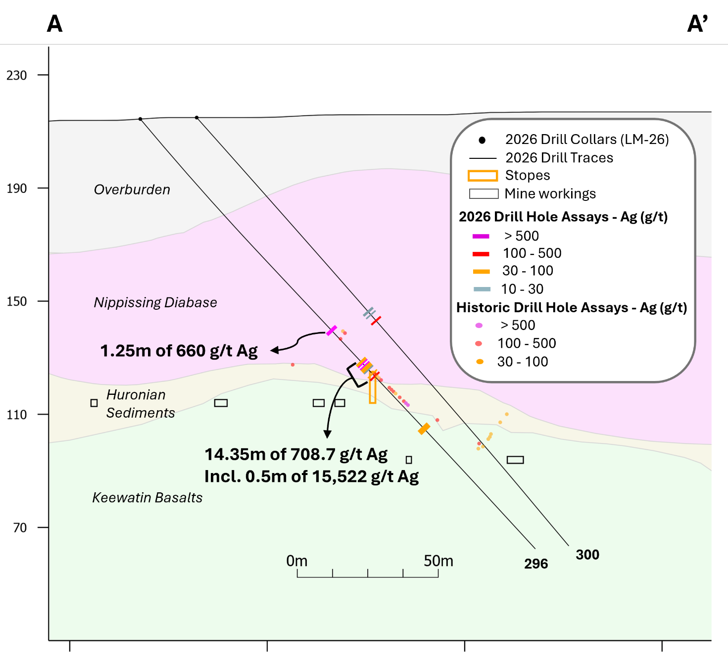 Figure 3. A to A’ Cross Section Looking North showing drillholes LM-26-296 and LM-26-300