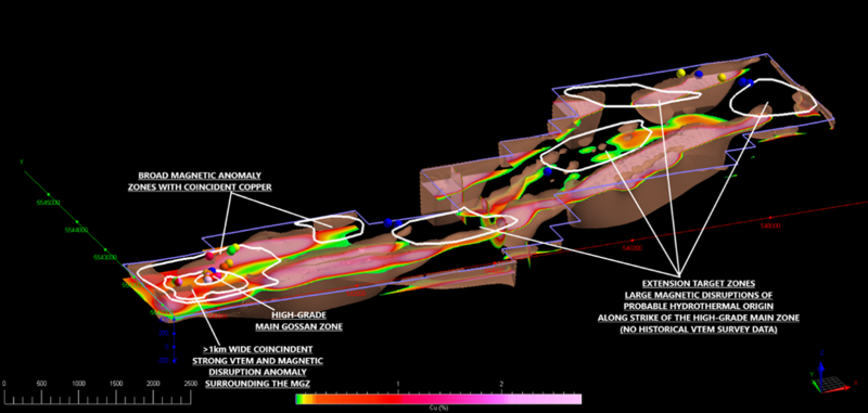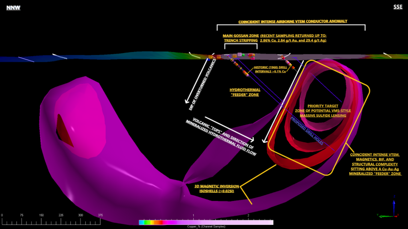 Cascade has developed its geological model for this Volcanogenic Massive Sulphide (VMS) style of deposit through a compilation of historic data, from new surface sampling collected by trenching and rock sampling that verifies the historic work and by flying high resolution drone based magnetics. Subsequent modelling in 3D and inverting the magnetic data has produced several target zones for copper, gold, and silver mineralization.