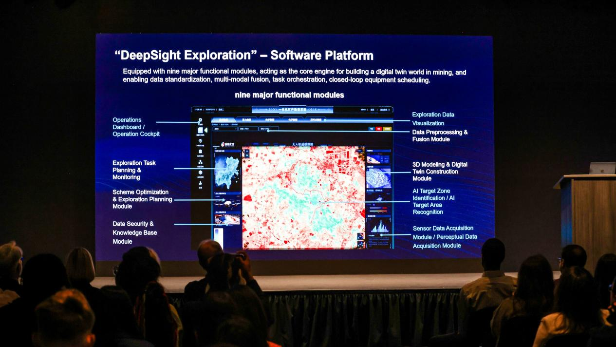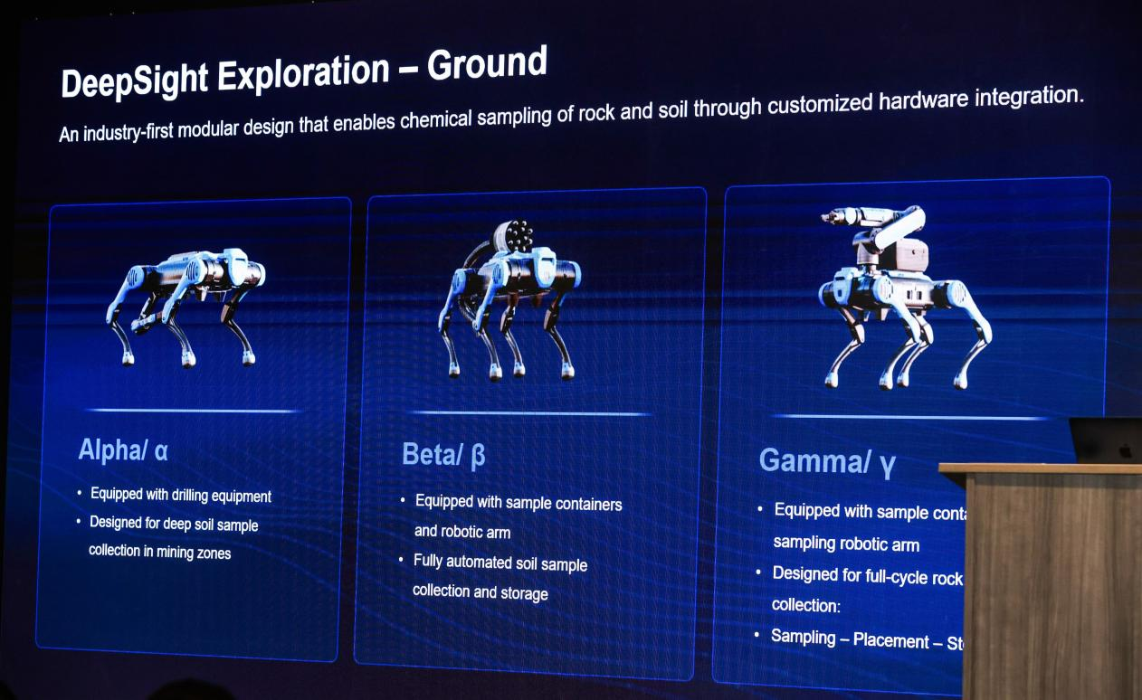 DeepSight Exploration combines hardware and software into a unified exploration workflow. Drone swarms equipped with multispectral, magnetic, and electromagnetic sensors conduct wide-area scanning and 3D mapping, while quadruped robots carry out autonomous sampling, including drilling and rock sample collection with precise geolocation. A data-driven control and modeling system integrates sensor outputs with geological knowledge to help engineers narrow search zones from thousands of square kilometers to targeted areas of just a few kilometers.