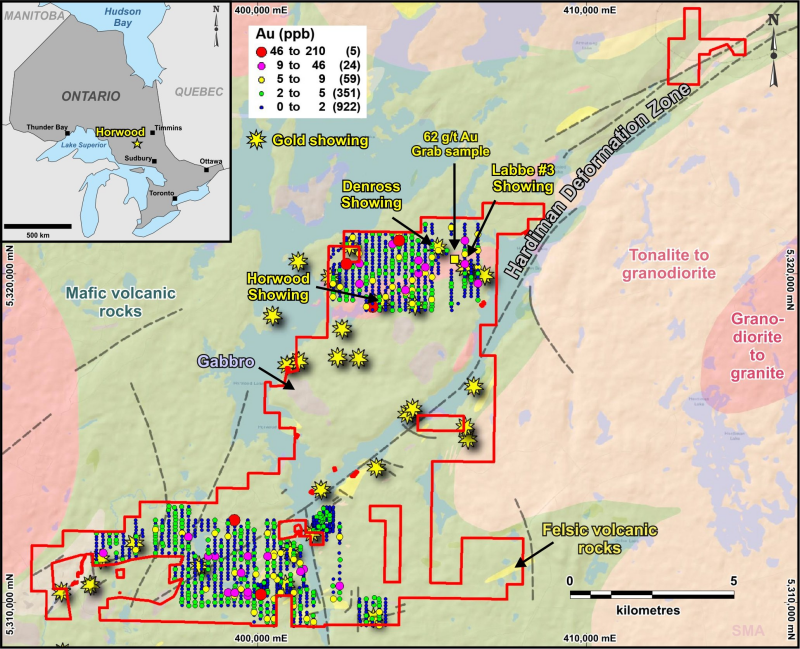 The Company has completed a comprehensive 1,361 sample, modern shallow soil campaign over two zones totaling 15.23 sq. km of the 94.6 sq. km Horwood Property (Figure 1), and it is pleased to report on the results of this work. The Horwood Property is located within the northeastern part of the Swayze Greenstone Belt and is located on a northeast-trending fault zone termed the Hardiman Deformation Zone, which is interpreted as a splay fault to the Destor-Porcupine Deformation Zone. The Hardiman Deformation Zone and associated splay faults are important to the formation of gold mineralization in the area, including sixteen (16) gold showings previously reported by the Ontario Mineral Deposit Inventory (MDI). The Horwood Property is underlain by Archean mafic volcanic flows, and is cut by a complex suite of intrusive rocks, including gabbroic sills and stocks, the granodioritic Horwood Peninsular Pluton, and numerous small quartz diorite and quartz-porphyry intrusions. Previous exploration work concentrated on outcrop mapping and prospecting, ground geophysics and follow-up drilling (122 drill holes for a 15,545 m)