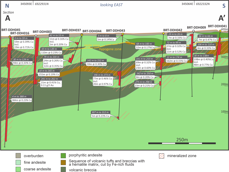 Drill hole BRT-DDH045: 384 m @ 0.22% Cu from 4 m, including 94 m @ 0.33% Cu from 30 m.