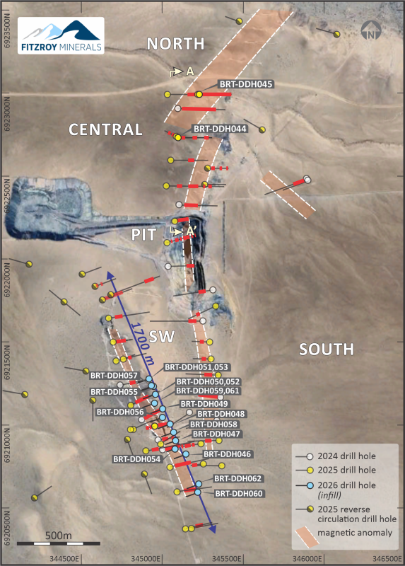 As previously reported (news release January 13, 2026), in the North area of the Buen Retiro Project, drilling has identified a copper-sulphide mineralized trend extending for approximately 1 kilometre north of the historical Manto Negro Mine open pit, hosted within a volcanic sequence dominated by andesitic rocks, interbedded with volcanic breccias and tuffs (Figure 1).