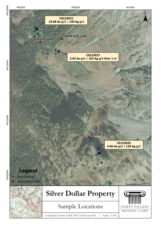 10.68 g/t Au and 140 g/t Ag returned from a grab sample at the Silver Dollar past-producer